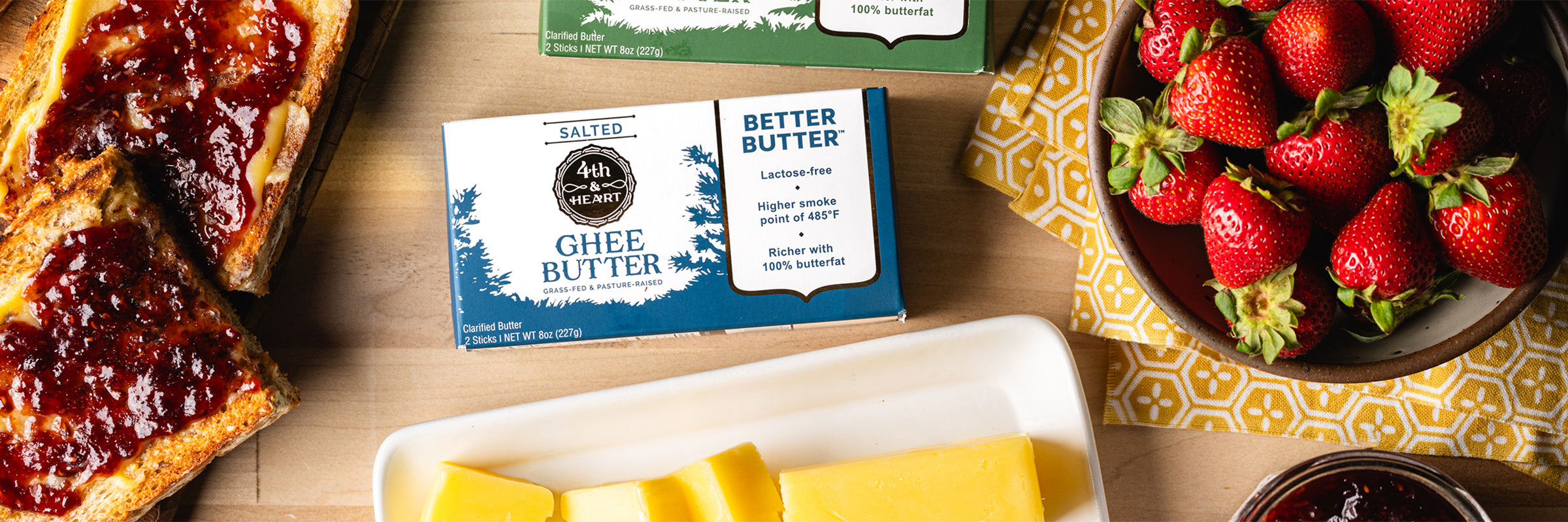 4th & Heart Ghee starts with the finest butter sourced from grass-fed, pasture-raised New Zealand and Australian cows. Through our cooking process, it's distilled into the purest form of butter, 100% butterfat. 4th & Heart Ghee has a rich, nutty, delicious flavor, is naturally lactose-free, and adds a more complex and deeper flavor to elevate any dish!